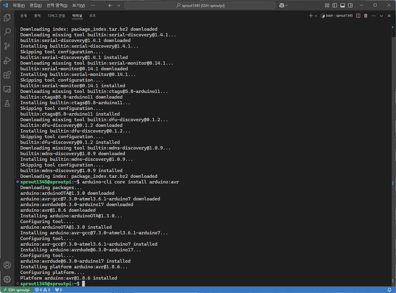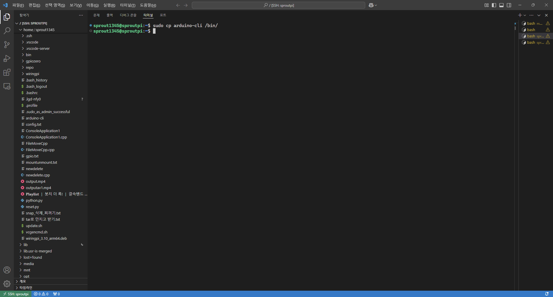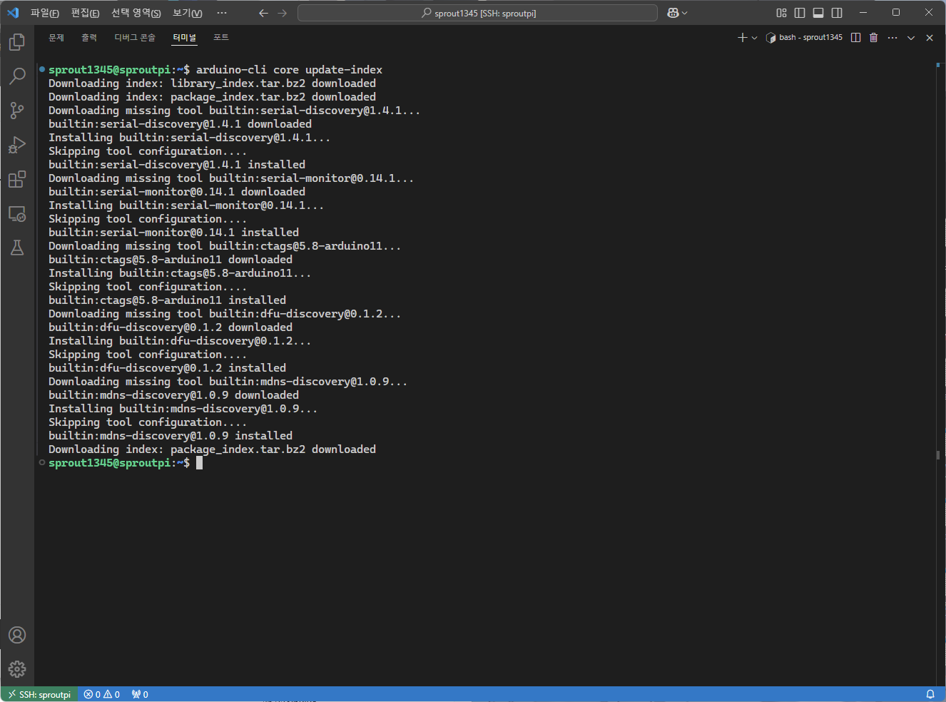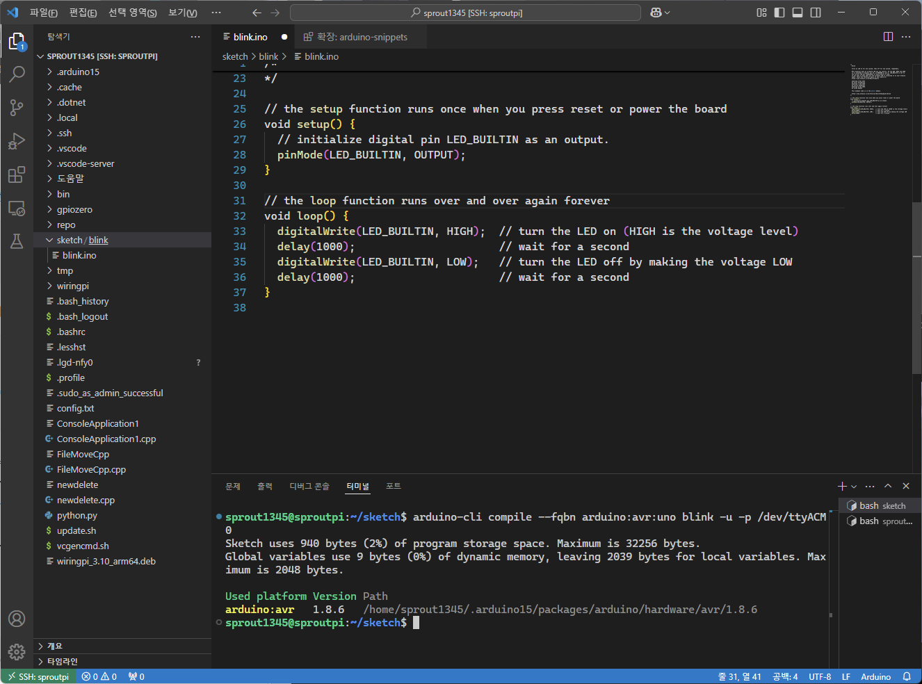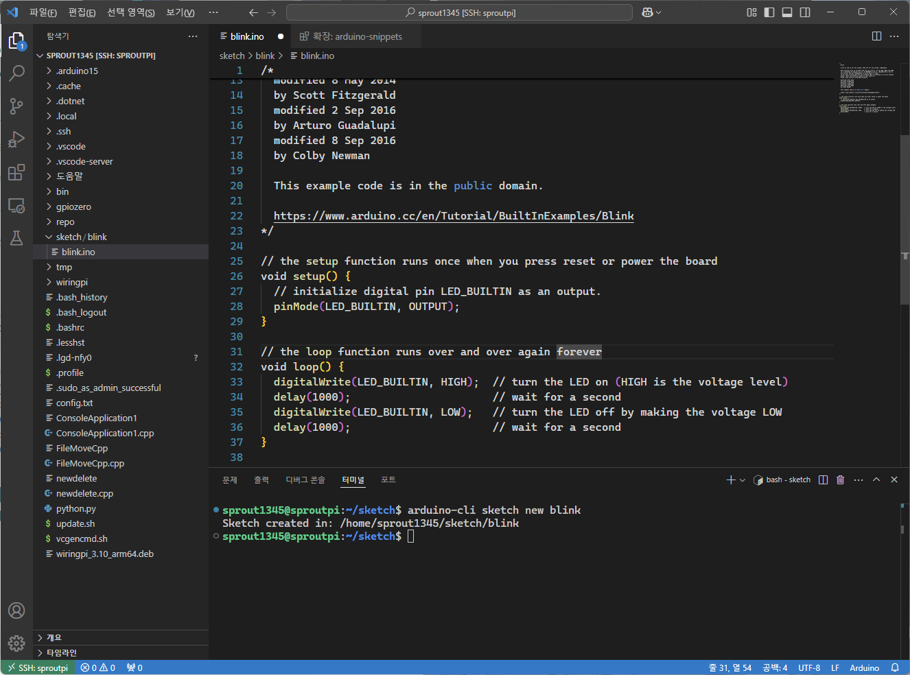 별도의 컴퓨터에서 Arduino IDE를 이용하여 스케치를 작성한 후 시스템으로 가져와도 되고, 위 이미지처럼 Visual Studio Code에 관련 Arduino 확장을 설치하고 SSH 접속으로 편집하여도 된다.