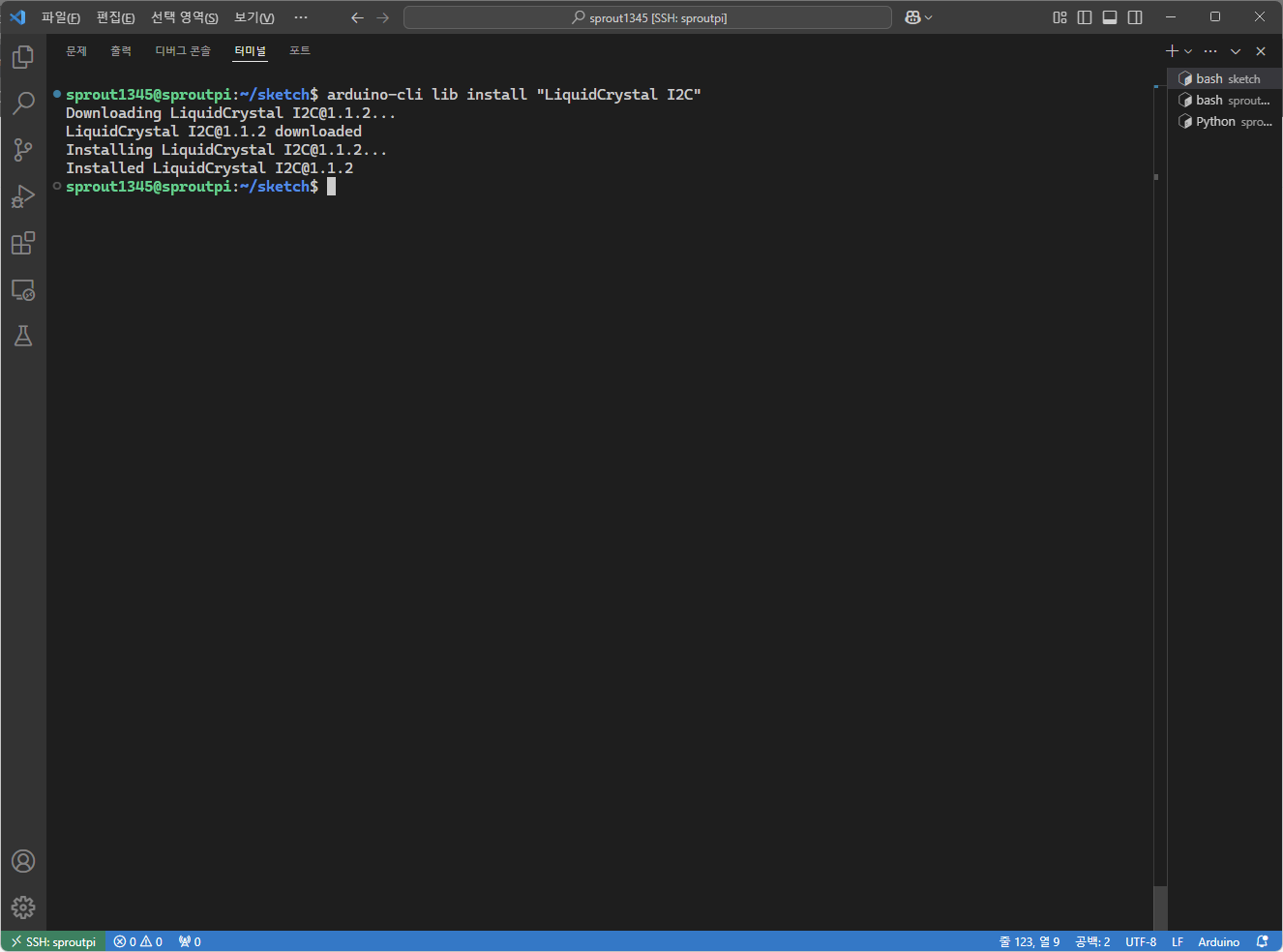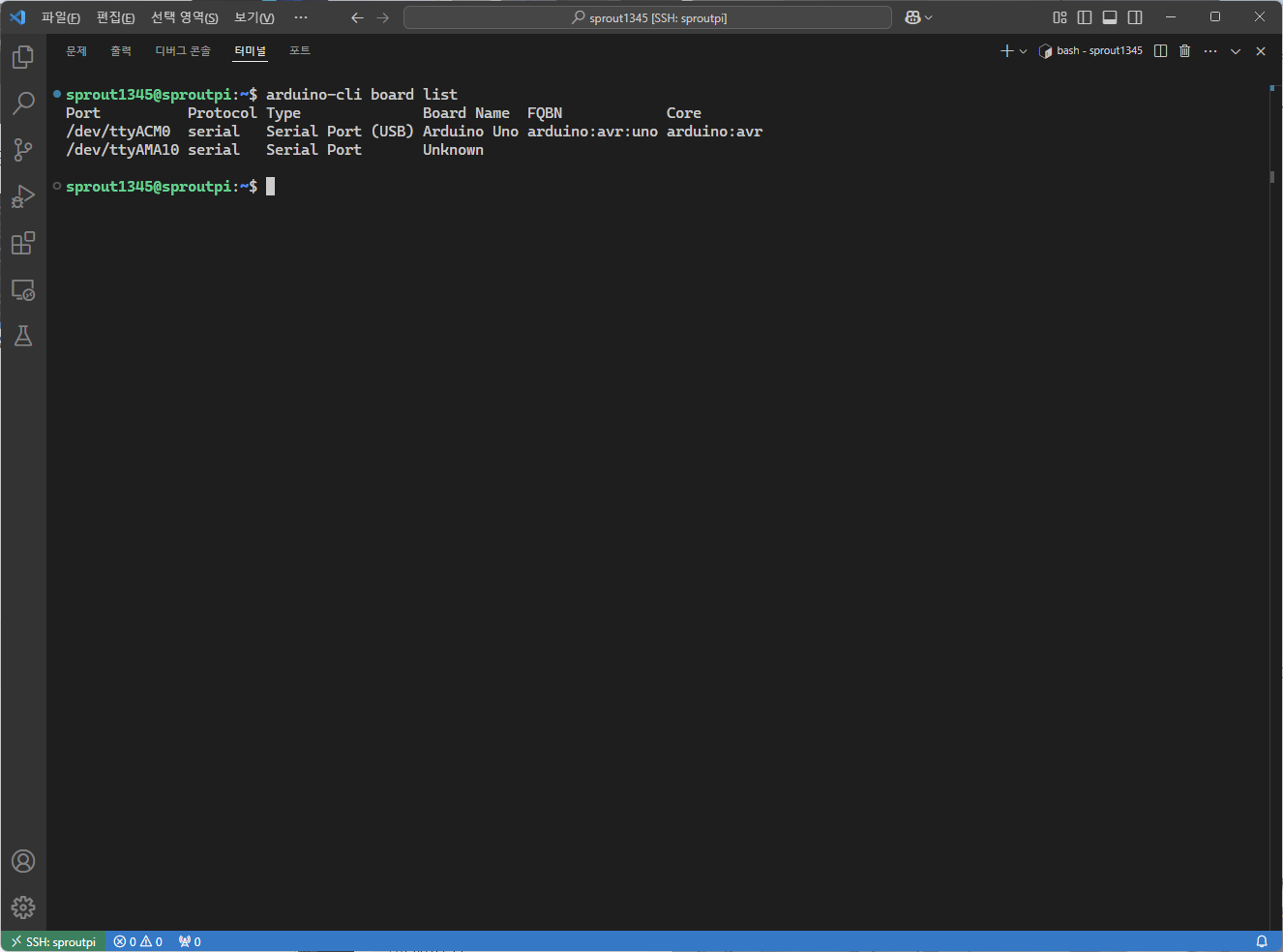 아두이노를 보드에 연결한 후 아래의 명령을 입력한다.