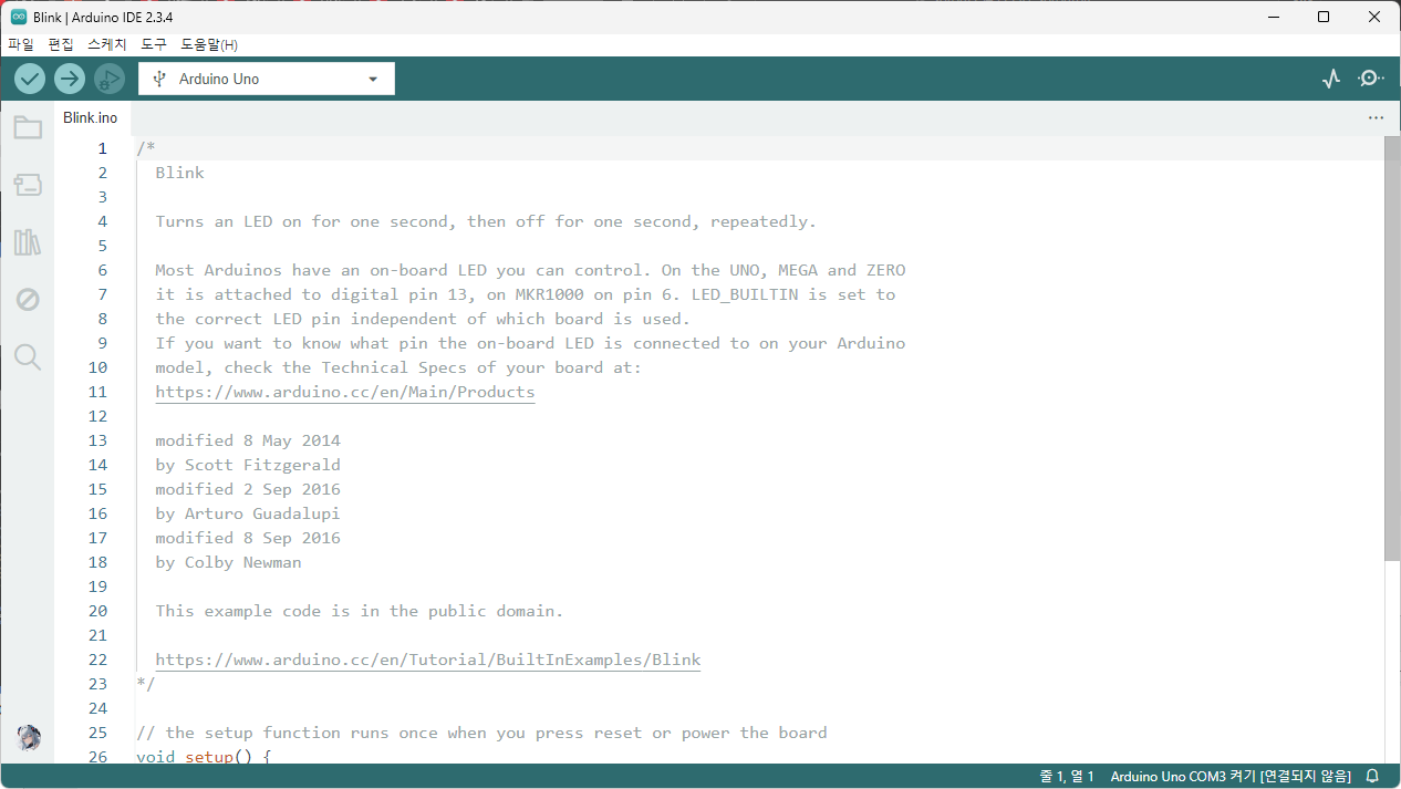 어쨌든 스케치를 하나 만들어보자. 가장 기초 예제인 Blink이다.