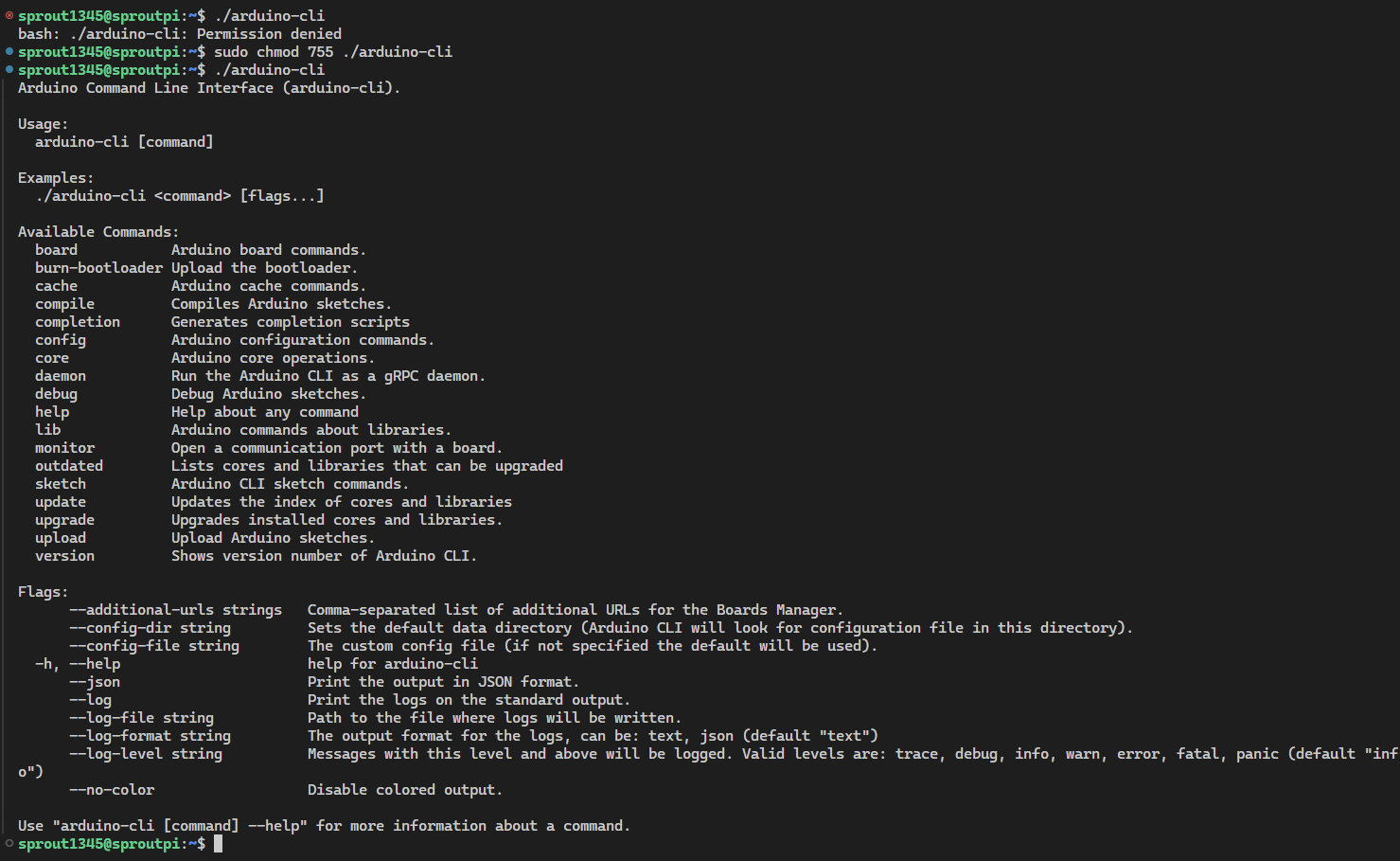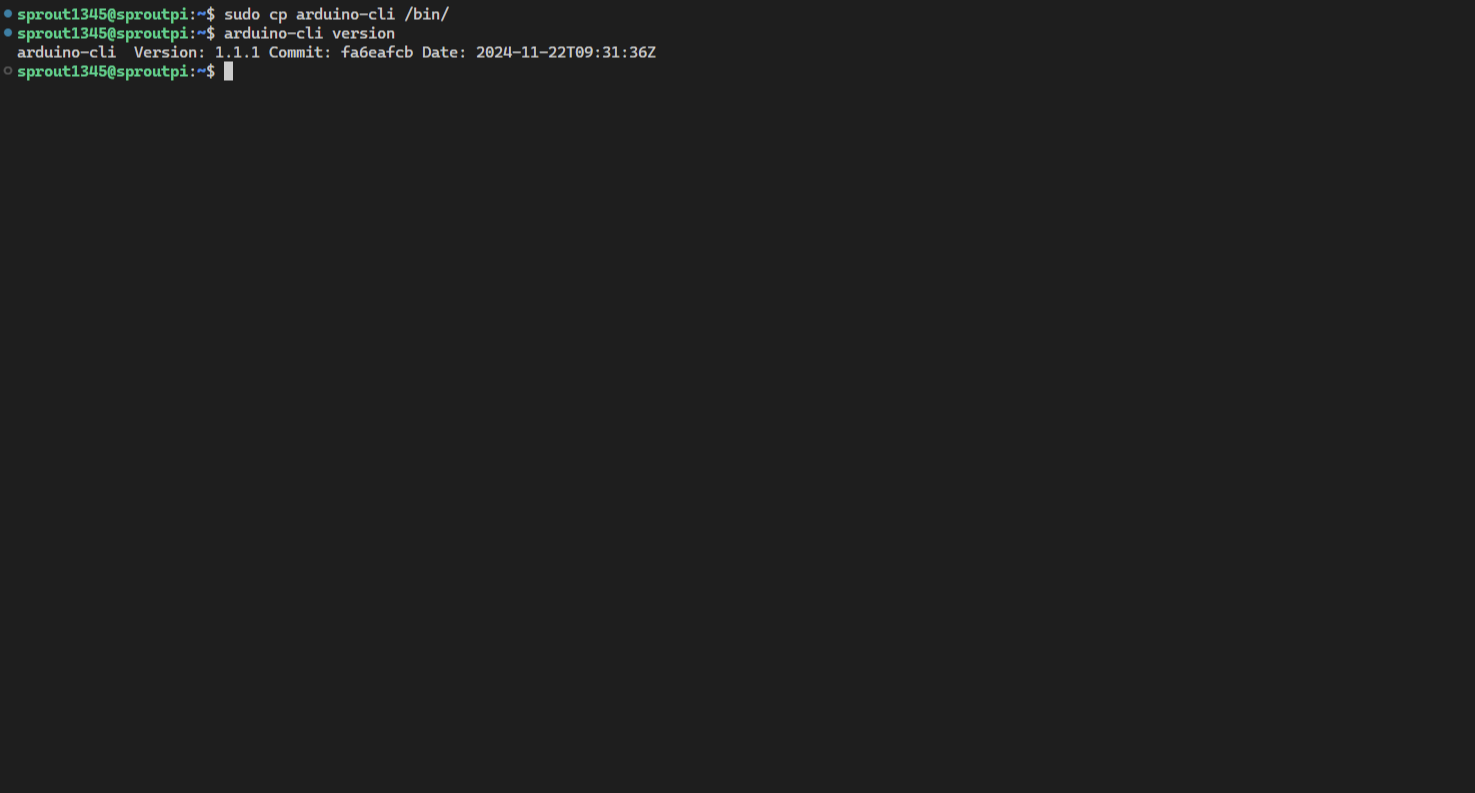 위의 명령은 $PWD/bin에 Arduino CLI를 설치하는 것이고, 아래의 명령은 sudo 권한으로 $PWD/bin 에 Arduino CLI를 설치하는 것이다.