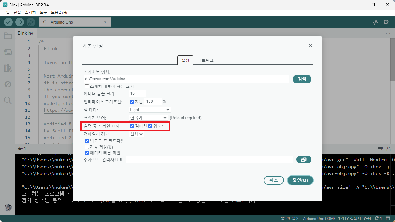 명령에 "--verbose" 옵션을 추가하면 자세한 정보를 출력하는데, 이는 Arduino IDE 설정의 '출력 중 자세한 표시'와 같은 설정이다.